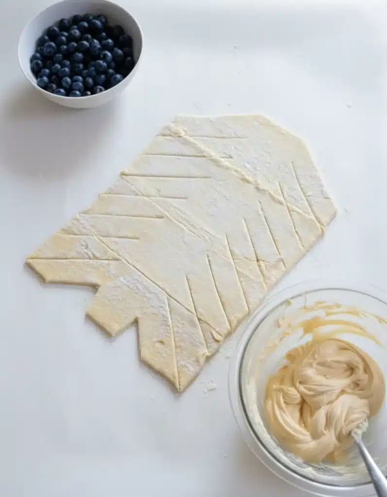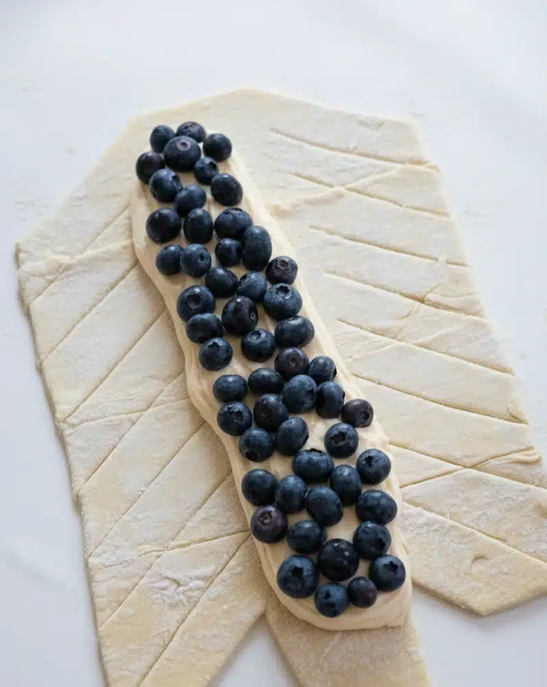 5. Spread the filling down the center of your pastry, leaving the cut strips free. Sprinkle those gorgeous blueberries right on top.