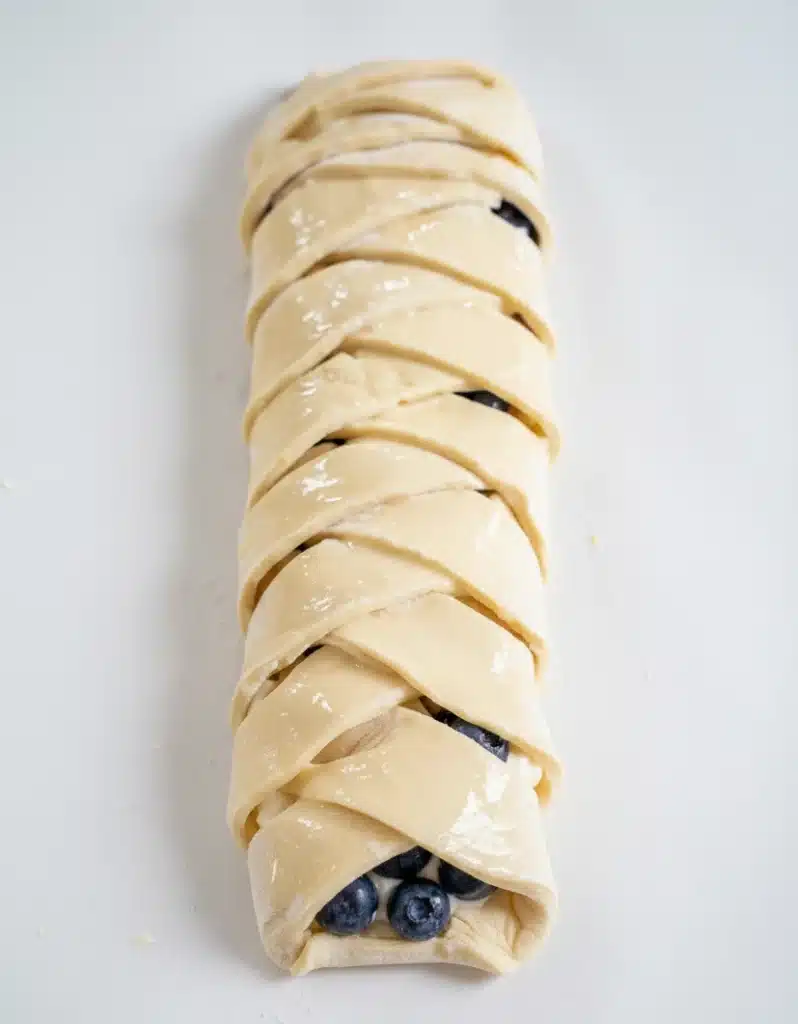 6. Fold the strips over the filling at a 45° angle, alternating from each side for a braid-like appearance.