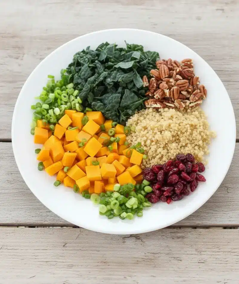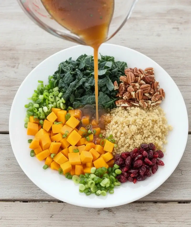 - Assemble everything: In a large bowl, combine the massaged kale, sliced green onions, chopped nuts, and cranberries. Add the cooked quinoa and roasted squash when theyโre ready.