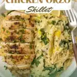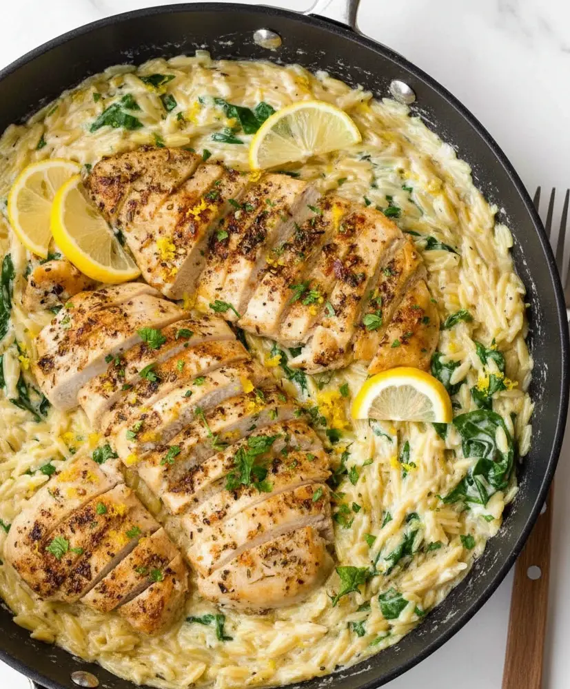A creamy, zesty Lemon Chicken Orzo bursting with bright lemon flavor, tender chicken, and cheesy spinach for the perfect one-pan meal.