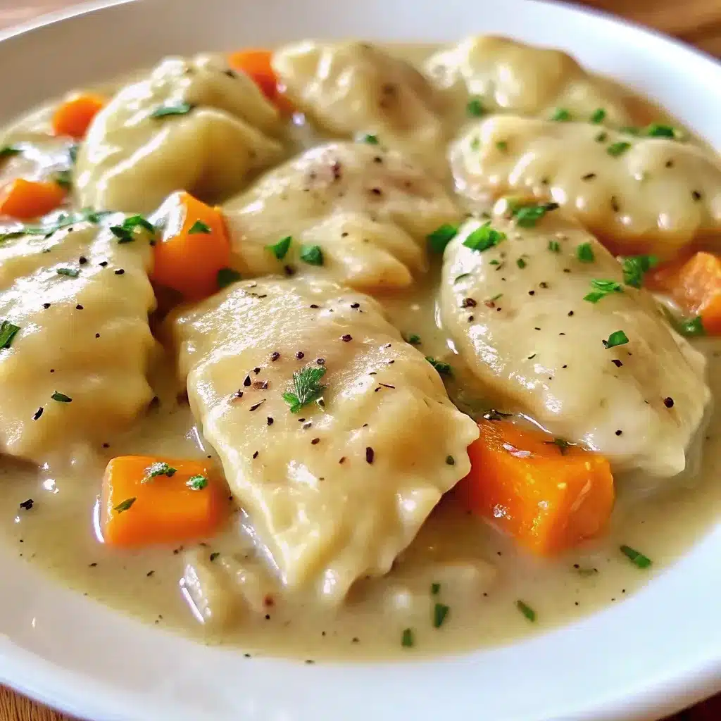 - Turn off heat, garnish with parsley, and serve. Dumplings firm up as they rest.
