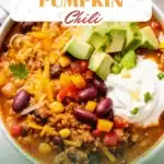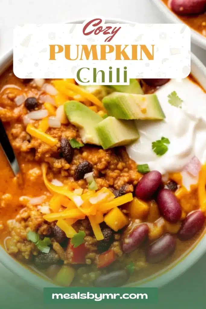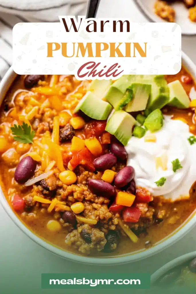 A hearty and flavorful pumpkin chili with ground beef, beans, and warm spices, perfect for cozy meals.