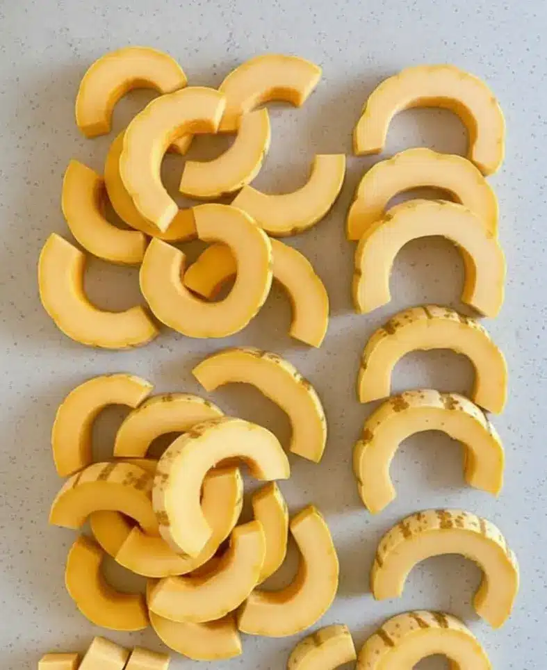 1. Preheat and prepย โ€“ Get your oven to 425ยฐF and line a baking sheet with parchment if you want easy cleanup. Halve your delicata squash lengthwise, scoop out the seeds, then slice into half-inch pieces. The skin stays on โ€“ thatโ€™s the beauty of delicata!